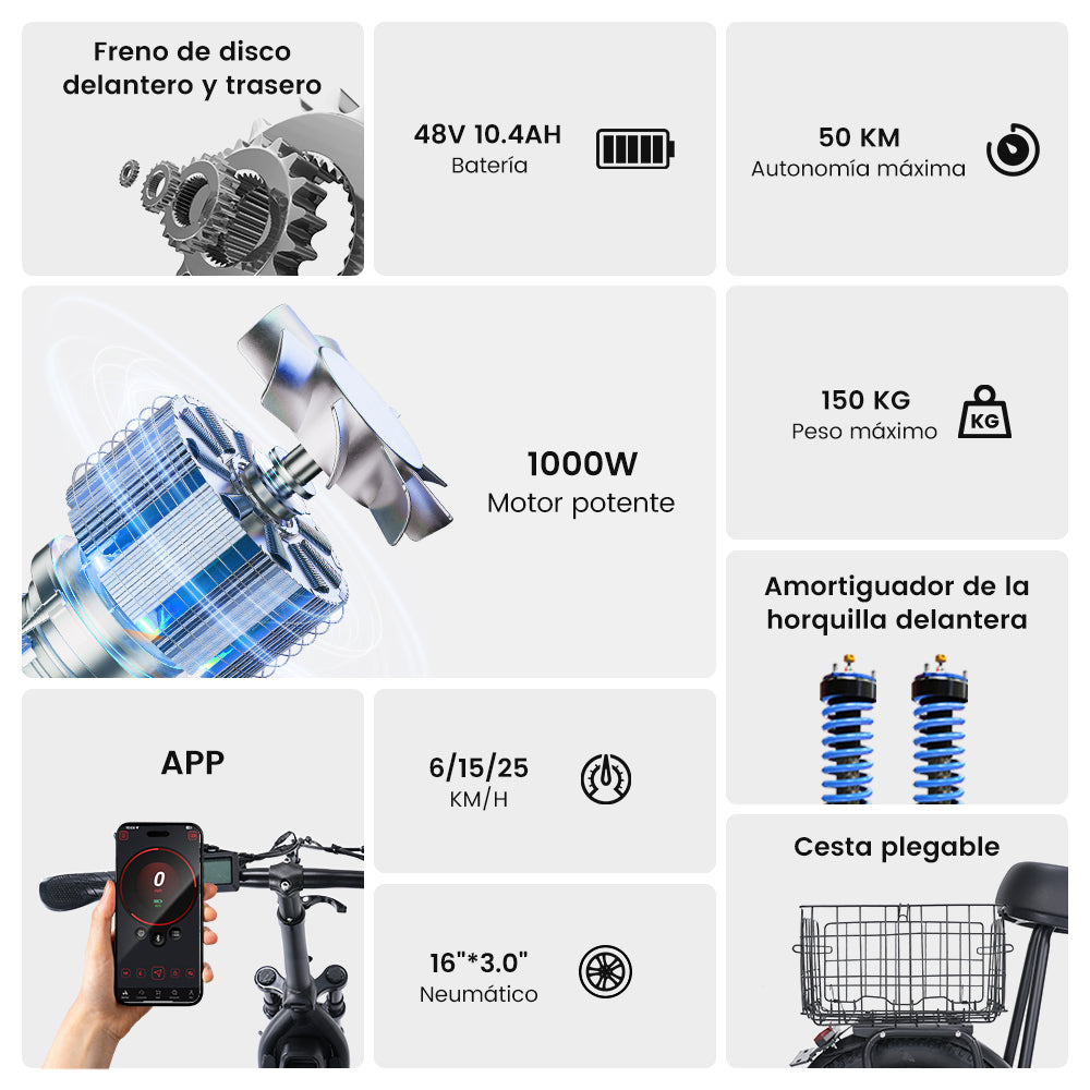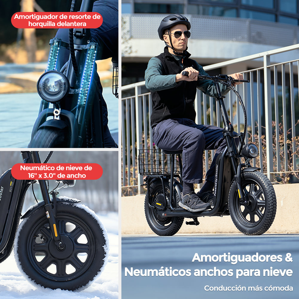 Sus neumáticos de 16" x 3" proporcionan una excelente adherencia en calles, caminos y carriles bici. Combinados con su amortiguador delantero, garantizan una conducción estable y cómoda incluso en superficies irregulares.
