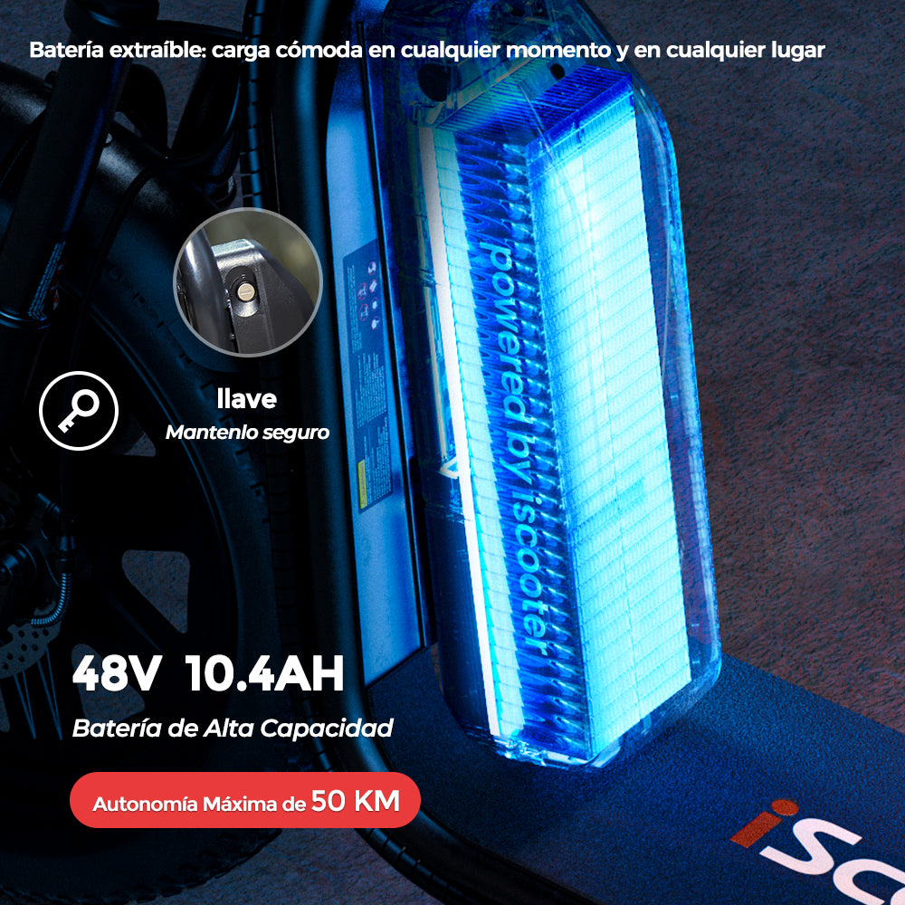 Equipado con un motor potente capaz de alcanzar una velocidad máxima de 45 km/h (limitado a 25 km/h según la normativa), el iScooter F7 ofrece una conducción dinámica y fluida. Su batería extraíble de 48V 10,4Ah permite una autonomía de hasta 50 km, además de facilitar la carga en casa o en la oficina.
